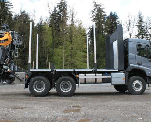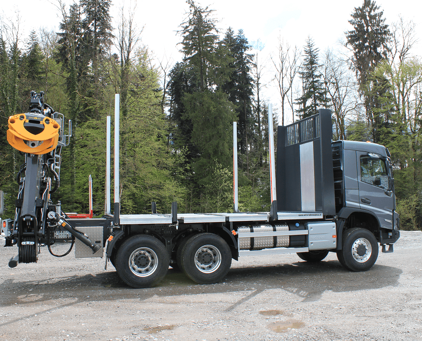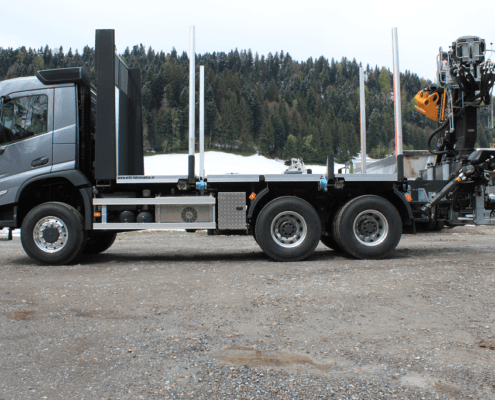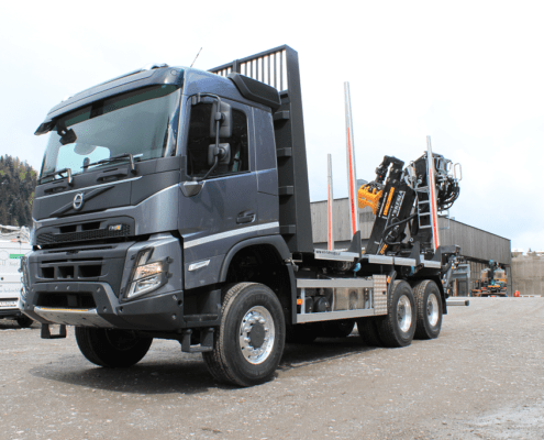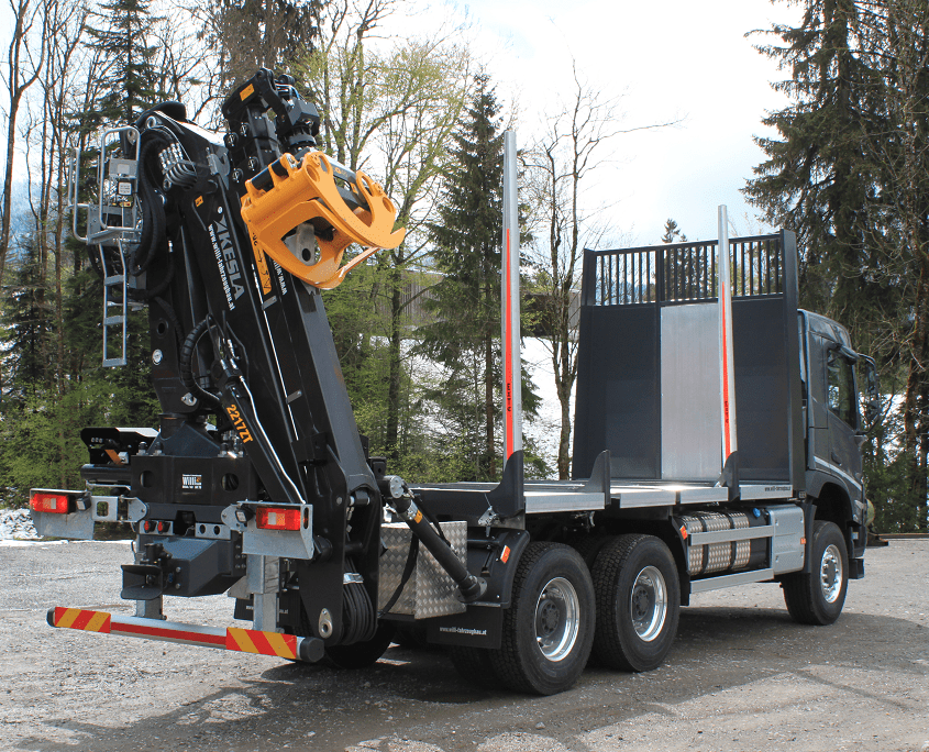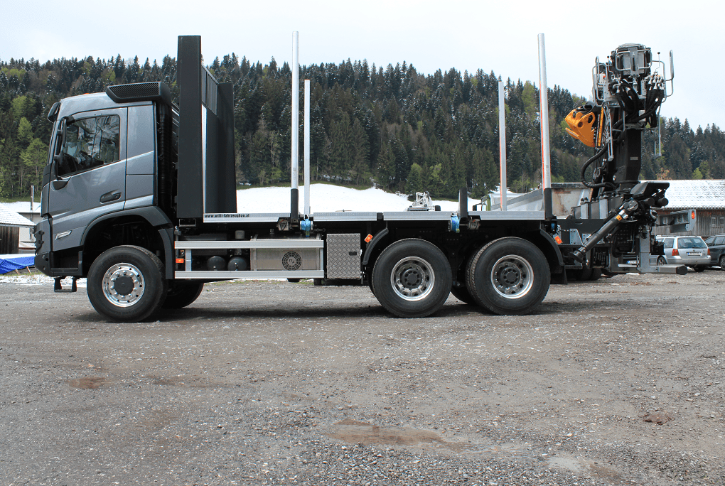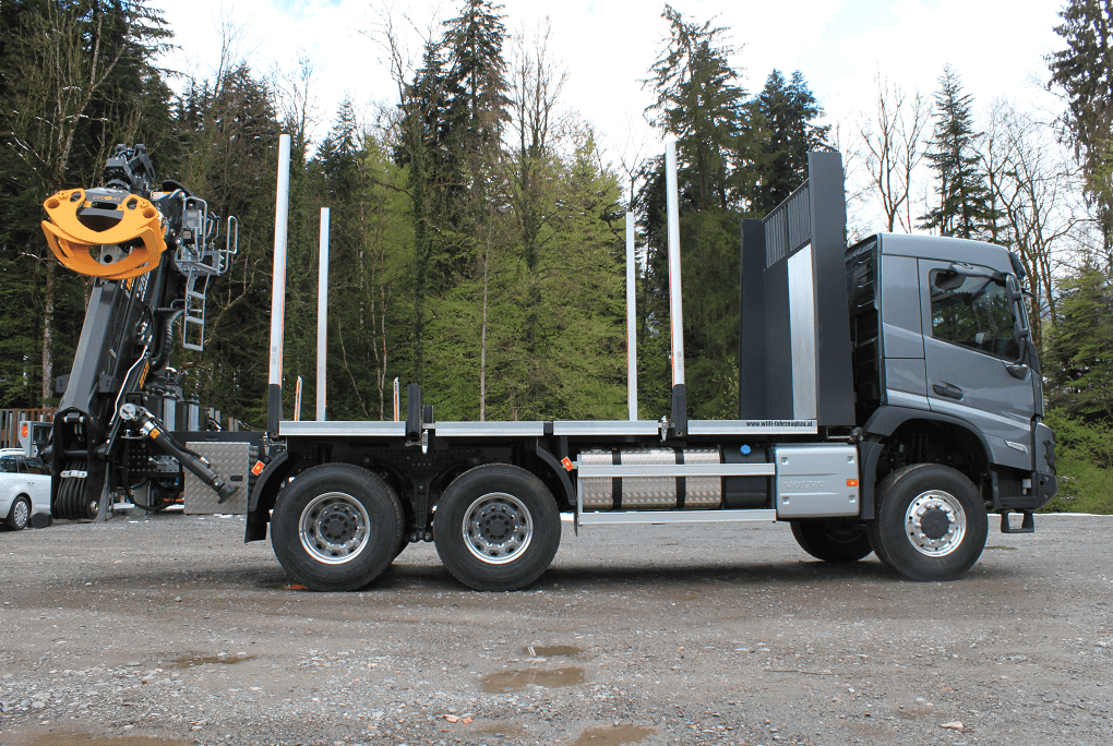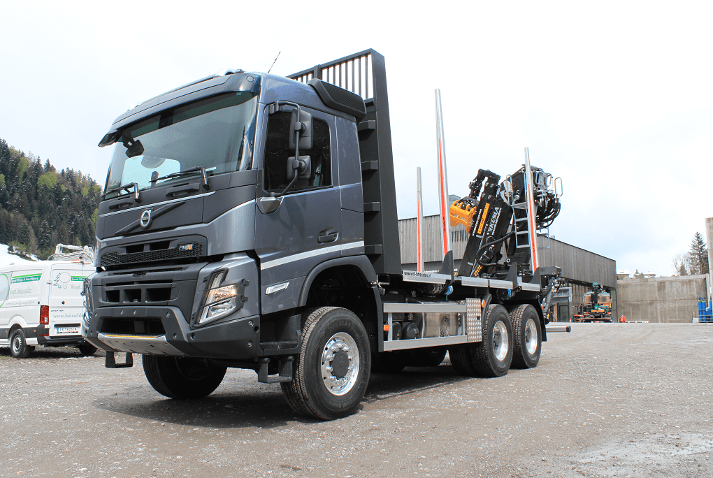 Der Volvo Fmx mit heckmontiertem Holzkran 2217ZT von Kesla ist ein wahres Kraftpaket. Der Aufbau zeichnet sich aus durch drei Rungenpaare, Aluboden und genug Stauraum für sämtliche Ausrüstung.