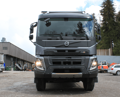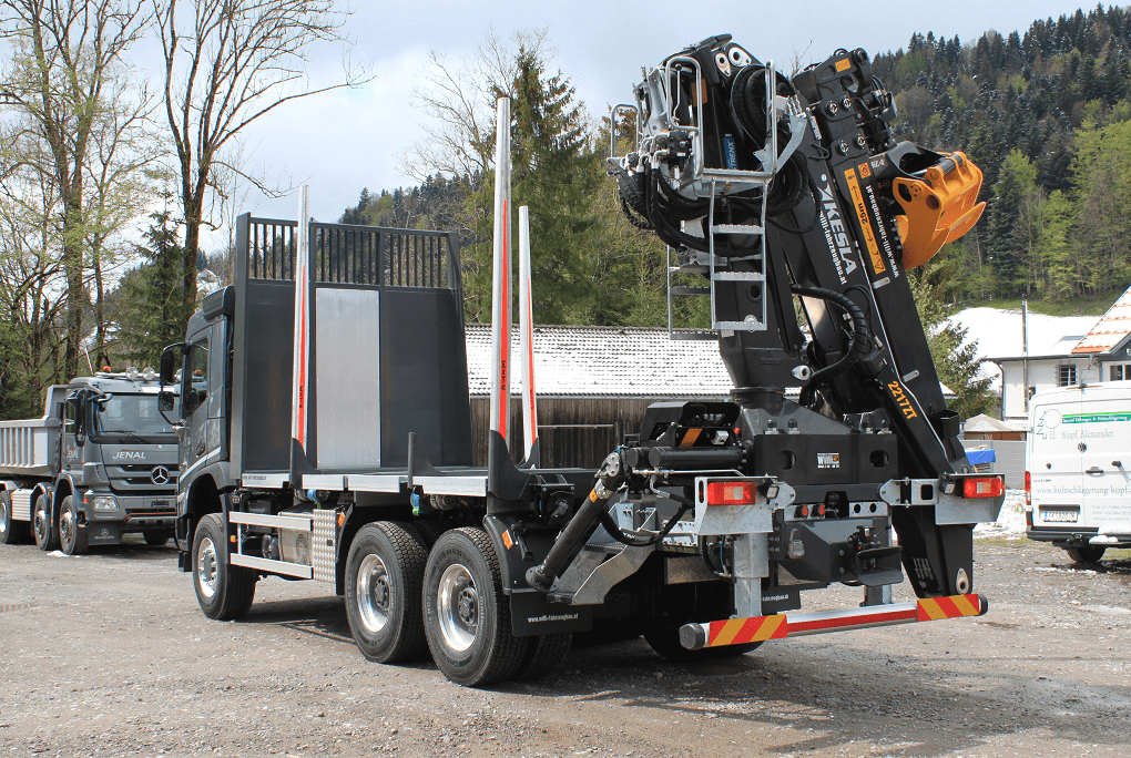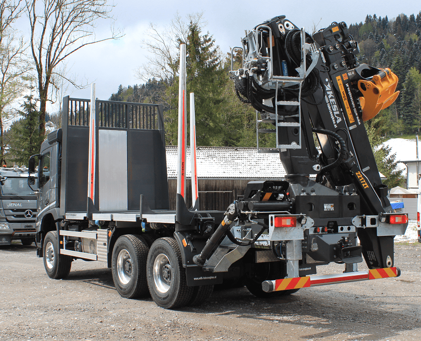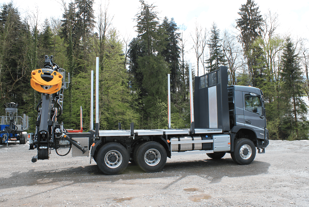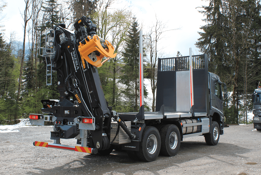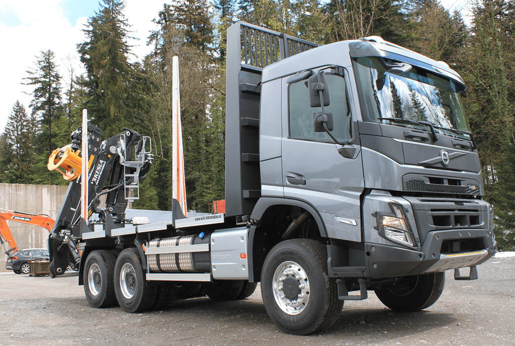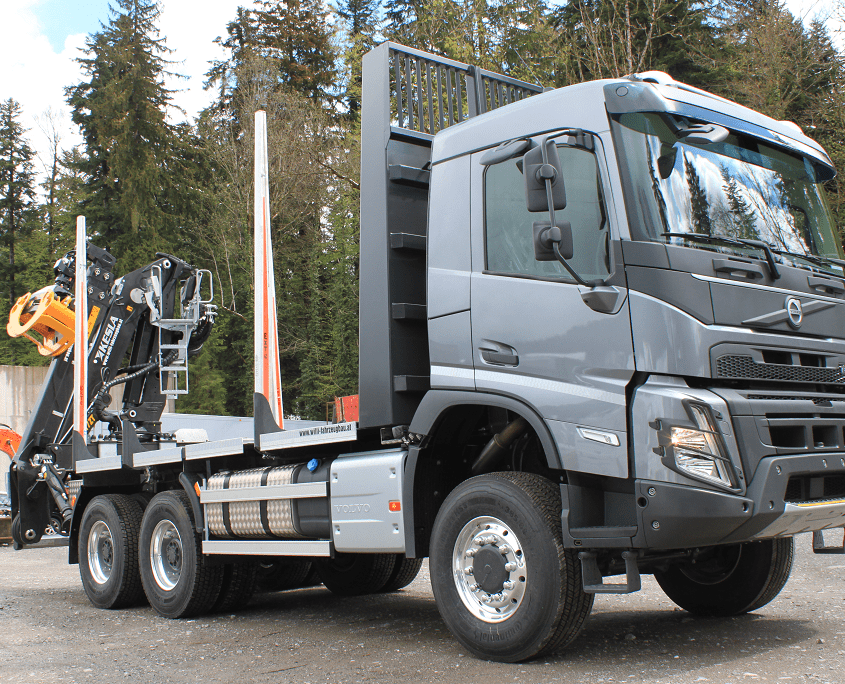 Der Volvo Fmx mit heckmontiertem Holzkran 2217ZT von Kesla ist ein wahres Kraftpaket. Der Aufbau zeichnet sich aus durch drei Rungenpaare, Aluboden und genug Stauraum für sämtliche Ausrüstung.